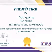 הטיפול הקוגניטיבי התנהגותי (CBT) מתמקד בזיהוי דפוסי חשיבה והתנהגות לא יעילים, שינוי תגובות רגשיות, ולמידת כלים לוויסות עצמי ולחוסן נפשי. אסף גיטלר מטפל מוסמך ומדריך בכיר בגישה הקוגניטיבית־התנהגותית, בעל ניסיון רב בעבודה עם חרדה, דיכאון, טראומה וכאב כרוני.